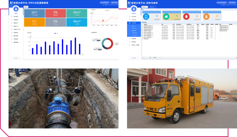 管網管理APP:具備管網查詢、監測點查詢、DMA漏損查詢、巡檢與工單派發等功能。